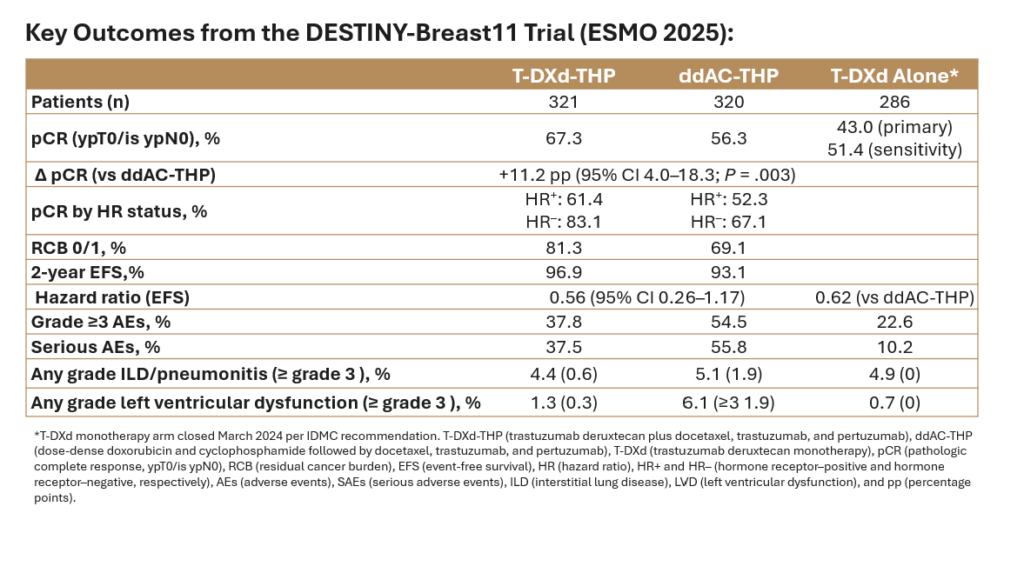 Harbeck N, et al. Trastuzumab deruxtecan–based neoadjuvant therapy in high-risk HER2-positive early breast cancer. Abstract 291O, presented at: ESMO 2025 Congress; October 2025; Barcelona, Spain.